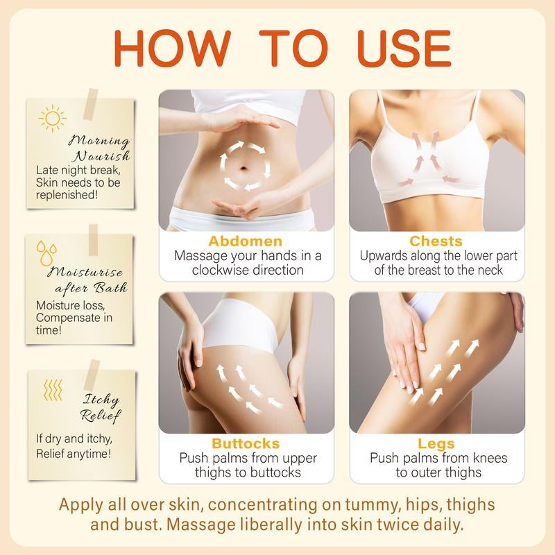 This soothing body lotion is uniquely formulated to soothe, moisturize and soften dry, itchy skin caused by pregnancy. It moisturizes the skin and helps retain essential moisture. Regular use can reduce the visible appearance of stretch marks and improve the appearance of stretch marks on the abdomen, chest, hips and buttocks, and increase skin elasticity and smoothness. Helps improve the appearance of stretch marks, dry, damaged skin, conditions the skin, and keeps the skin moisturized as the abdomen and skin stretch during pregnancy.